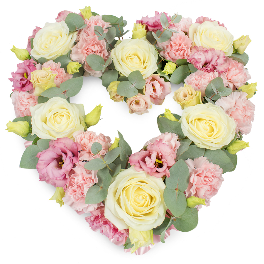 A softly coloured, heart-shaped wreath takes centre stage against a clean white background, its gentle hues and generous fullness creating an atmosphere of peace and affection. The heart is flawlessly formed, its curves smoothed by a dense covering of blooms that sit closely together without gaps, giving a sense of completeness and attentive design. Creamy ivory and pale yellow roses act as the primary feature, their velvety petals spiralling towards a rounded, open form that feels both classic and comforting. Between these roses, numerous pastel pink carnations are clustered in small groups, their frilled edges and layered petals lending a romantic, cushiony texture. Nestled among them, lisianthus blossoms in richer pink and soft mauve tones reveal slightly more open, trumpet-shaped petals, adding variety in form and gentle depths of colour. Throughout the wreath, stems of silvery-green eucalyptus weave naturally, the rounded leaves providing a cool contrast and creating a framing effect that emphasises the heart outline. Tiny yellow-green buds appear here and there, subtle details that suggest fresh, just-opened flowers and meticulous, recent preparation. The mood of the piece is reflective and full of love, something you could imagine being delivered quietly to a service in Somers Town or a nearby venue along Euston Road, perhaps chosen by a family remembering someone dear. With its calm palette of pink, cream, and green, the wreath expresses sympathy and remembrance without feeling heavy, making it suitable for funerals, memorials, and anniversary tributes. Against the uncluttered white background, every nuance of petal, leaf, and colour becomes part of a serene, heartfelt message of farewell.