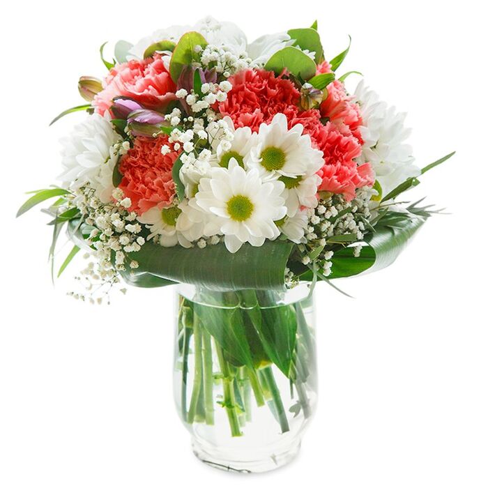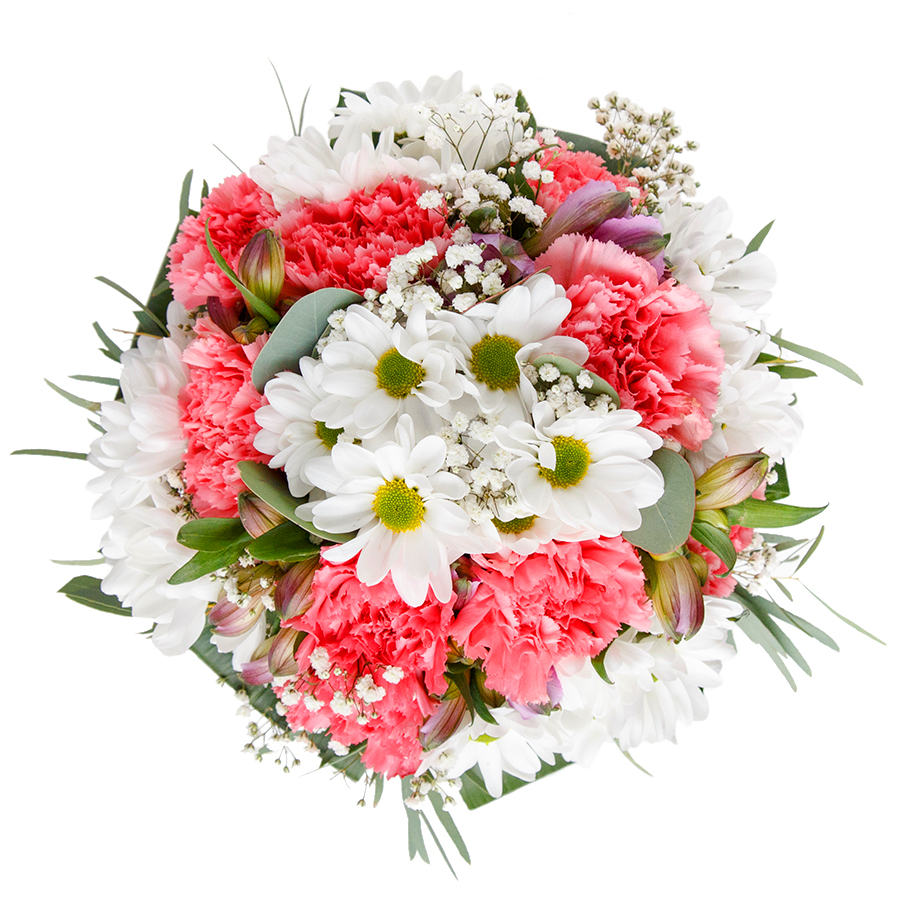 Celebrate any occasion with our elegant bouquet, a stunning mix of white and pink blossoms. This arrangement features snow-white chrysanthemums, delicate gypsophila, soft light pink carnations, and vibrant aspidistra leaves, all hand-selected to ensure exceptional freshness and quality.